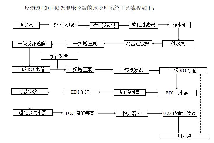 為保證關鍵設備反滲透裝置的長期可靠穩(wěn)定運行,則必須設置預處理系統(tǒng),滿足反滲透膜(RO)進水指標:濁度<0.5NTU、SDI<4、余氯<0.1ppm。根據原水水質,預處理系統(tǒng)由多介質過濾器、活性炭過濾器、加藥系統(tǒng)及相關輔助設備組成。 反滲透+EDI+拋光混床脫鹽的水處理系統(tǒng)工藝流程如下: